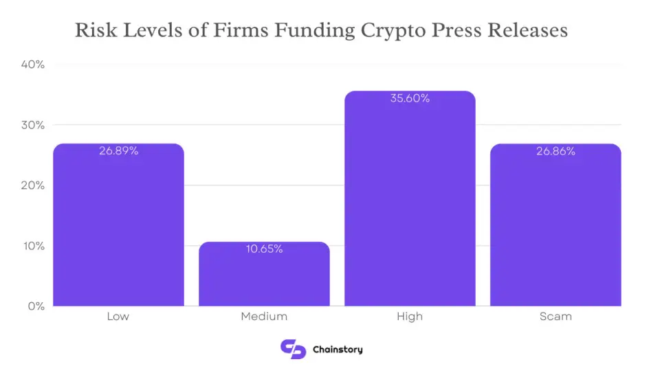 62% пресс-релизов направляются средствам массовой информации криптопроектами, которые созданы мошенниками или предлагают слишком рискованные услуги, выяснили специалисты компании Chainstory. Причем такие релизы массово публикуются на новостных площадках за деньги, обходя редакционные фильтры и вводя в заблуждение читателей, констатировали эксперты.