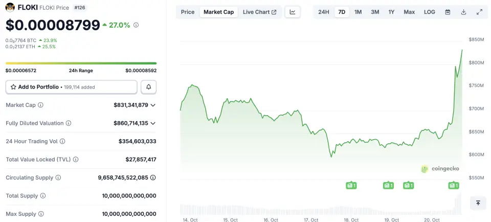 До публикации цена Floki Inu была на дневном минимуме в $0,00006549, прирост составил 29%. Объем торгов подскочил более чем на 500%, отражая всплеск активности инвесторов.