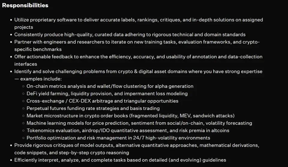 Криптоэксперт-соискатель должен уметь обучать ИИ ончейн-анализу, знаниям о денежных потоках, децентрализованных финансах, фарминге, кросс-биржевом арбитраже и распространенных криптоинструментах. Кроме того, AI-тренер обязан обучить нейросеть, как реагировать в случае падения ликвидности на крипторынке, что делать в случае реализации различных рисков и как оптимизировать портфель в случае высокой волатильности рынка.