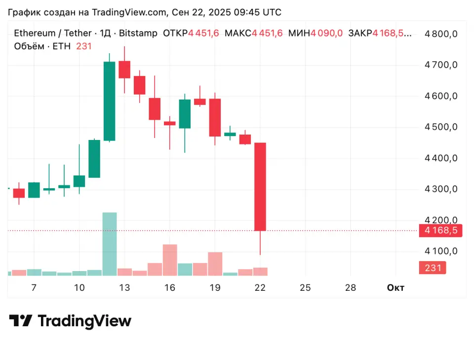 Согласно данным аналитической платформы Coinglass, падение стоимости цифровых активов носило массовый характер и затронуло все ведущие криптовалюты. В моменте эфир упал почти на 9% и пробил отметку $4100. Биткоин рухнул на 3%, до $111 998, стирая всю краткосрочную прибыль инвесторов.