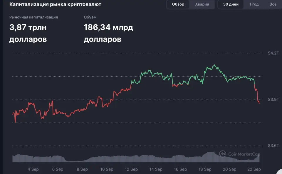 В понедельник, 22 сентября, рынок цифровых активов столкнулся с массовой ликвидацией перекупленных длинных позиций трейдеров и потерял капитализацию в $1 млрд менее чем за час.